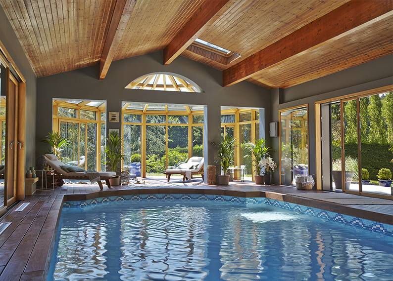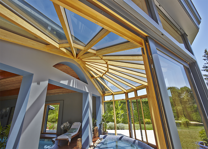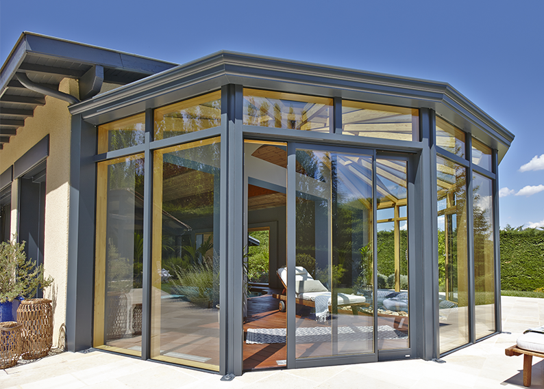 Véranda menuiserie bois mixte bordeaux.