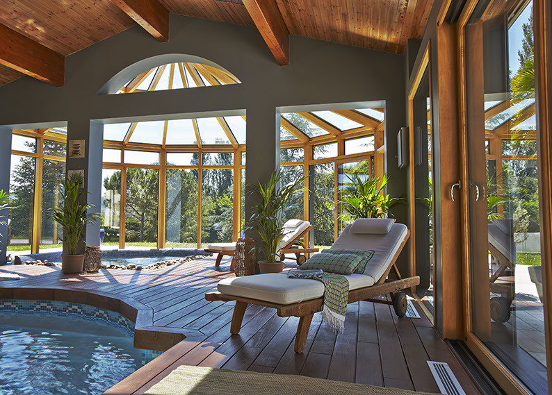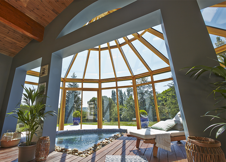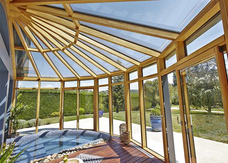 Véranda menuiserie bois mixte bordeaux.