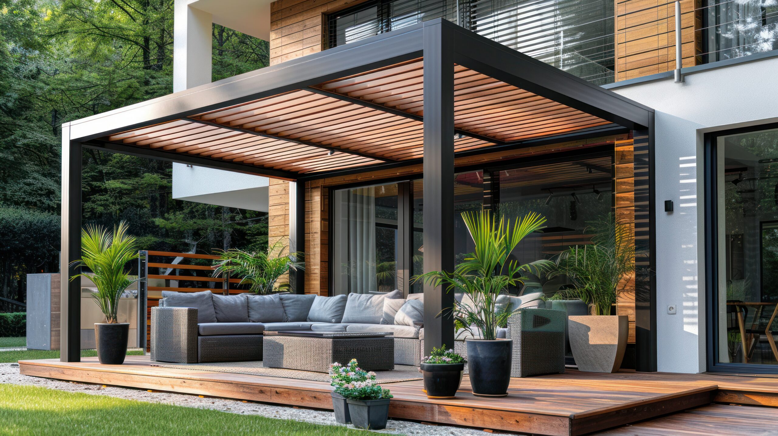 En général, nous conseillons une pergola adossée pour les terrasses de taille modeste, et une pergola autoportante pour les extérieurs plus spacieux.